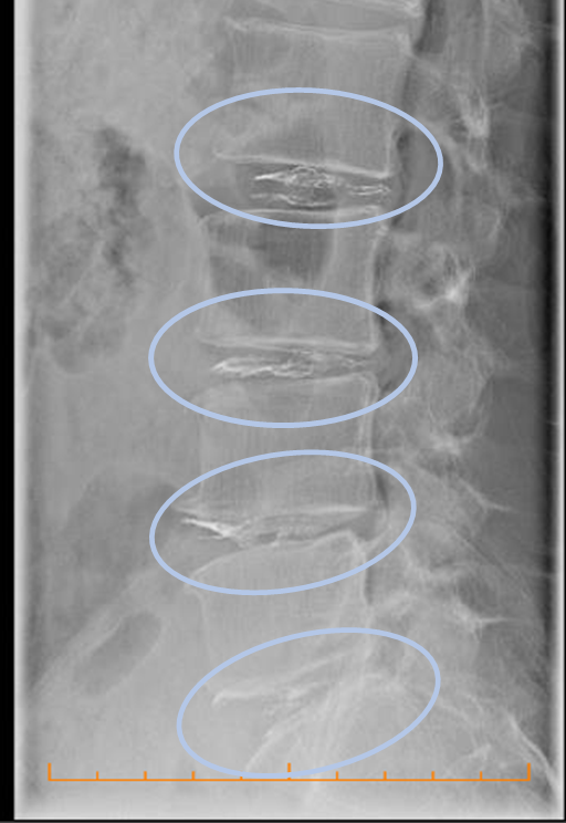 The Discogel injected into the four intervertebral discs is clearly visible.