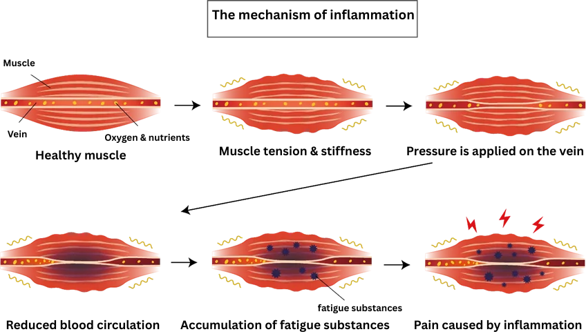 When muscles are overused, they become unable to withstand the fatigue and become tense (they harden). Tight muscles and fascia compress blood vessels, leading to reduced blood flow. As circulation worsens, metabolic waste products accumulate. Moving the body while the muscles and fascia remain stiff can convert this buildup of waste products into pain.