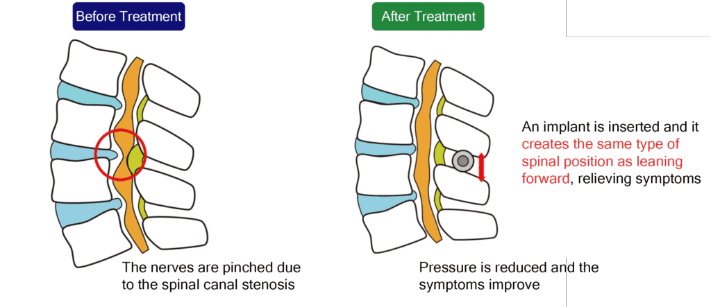 A device is percutaneously inserted under local anesthesia and sedation to widen the narrowed spinal canal.