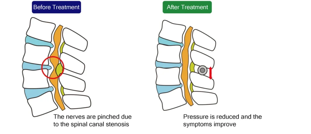 By inserting the device, the procedure aims to stabilize the vertebral body while maintaining spinal rotation and flexion, widen the spinal canal, suppress disc protrusion, and reduce ligamentum flavum hypertrophy (thickening). The widening of the narrowed spinal canal leads to pain relief.