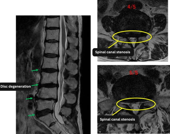 | L5/S | Degeneration, bulging, bilateral foraminal stenosis |