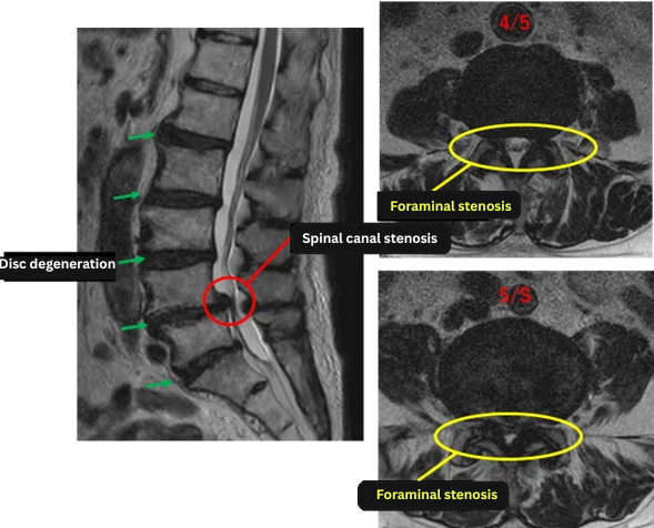 Findings indicate spinal canal stenosis, disc degeneration, and foraminal stenosis at L2/3, L3/4, L4/5, and L5/S, which are likely the main causes of the patient’s symptoms.