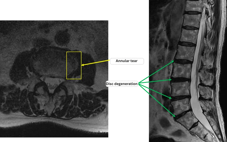 Disc degeneration and annular tear at L2/3, L3/4, L4/5, L5/S are highly suspected to be the primary cause of symptoms.