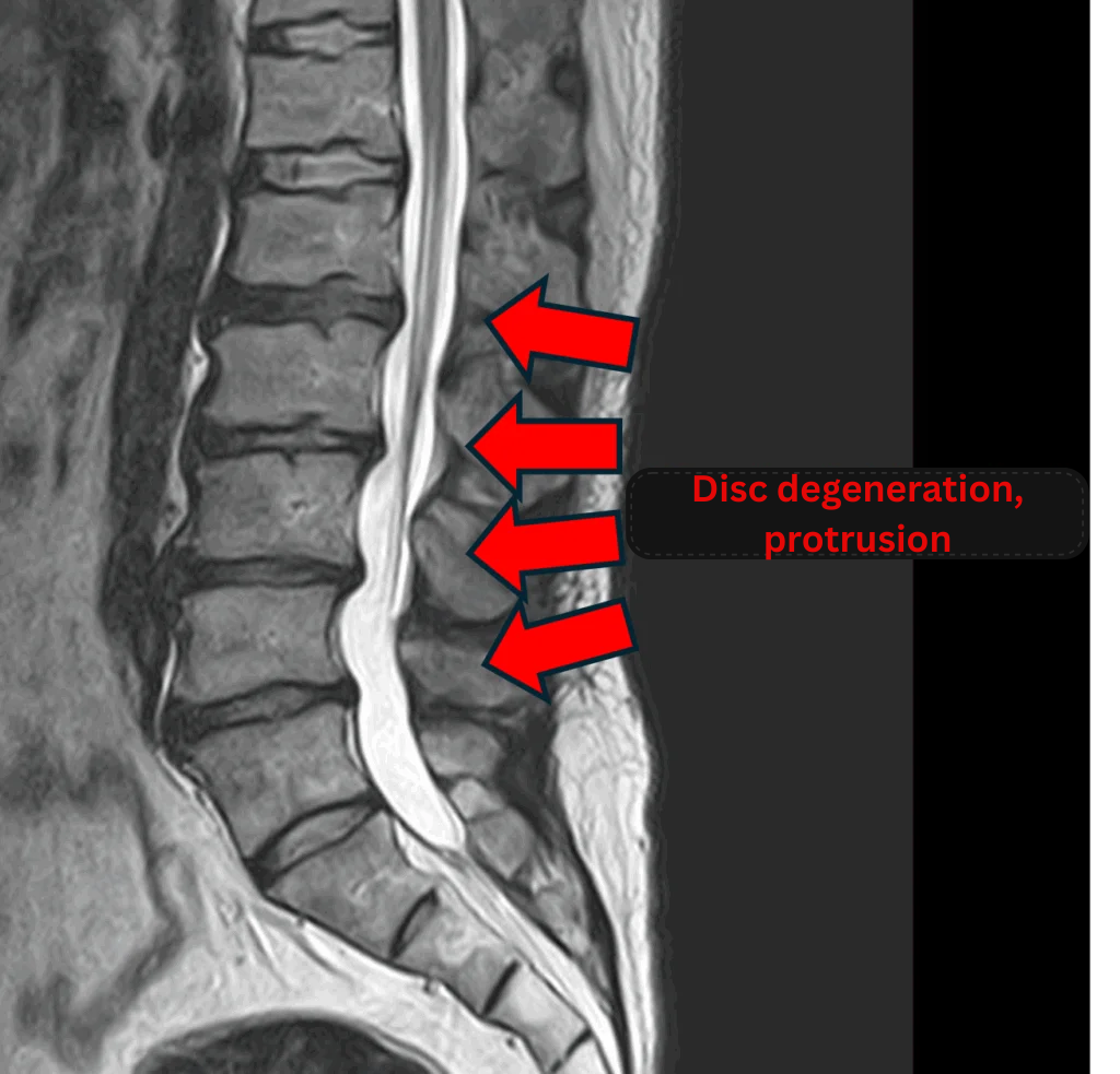 - L2/3, L3/4, L4/5, L5/S: disc degeneration and protrusion