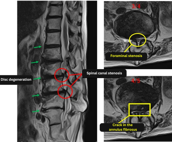 Based on these findings, L3/4 and L4/5 showed disc degeneration, spinal canal stenosis, and annular tears, and were considered highly likely to be the primary sources of the patient’s symptoms.