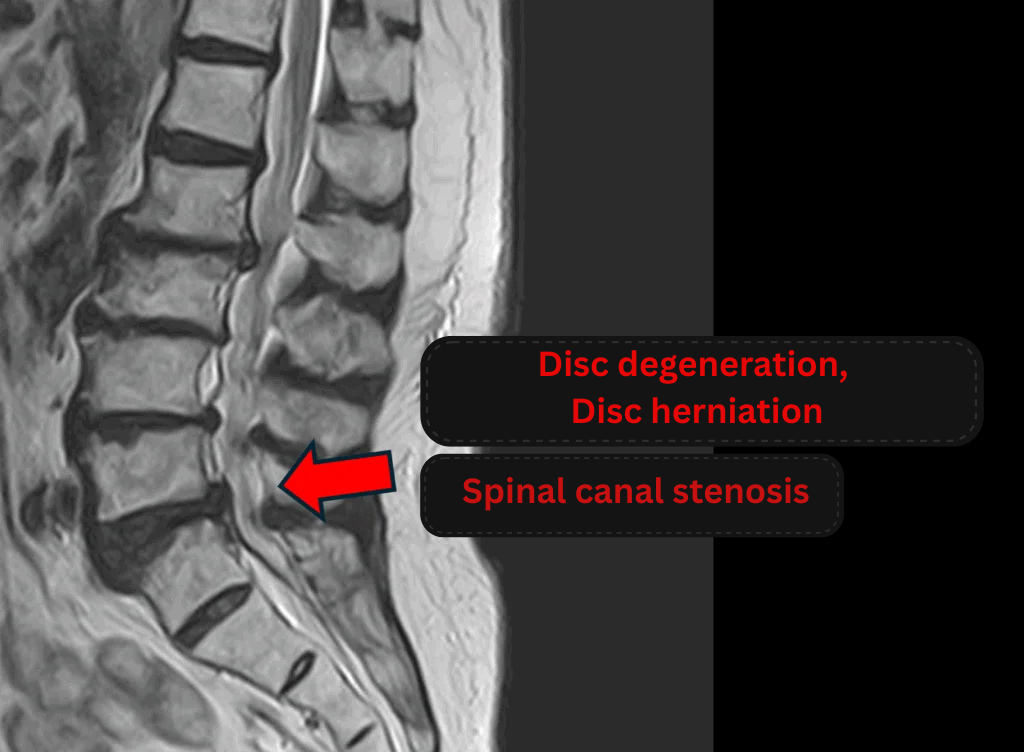 - L5/S1: Disc degeneration, herniated disc, and spinal stenosis.