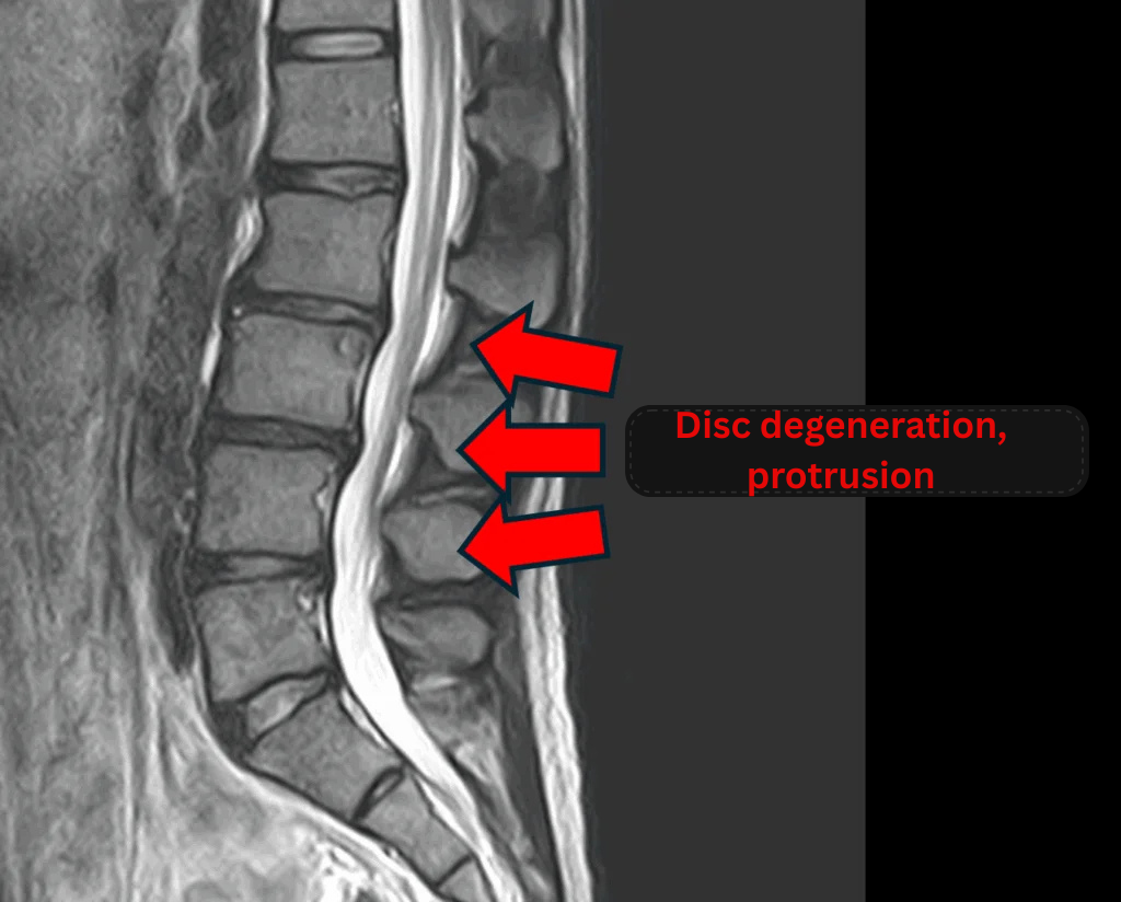 - L2/3, L3/4, L4/5: Disc degeneration and bulging