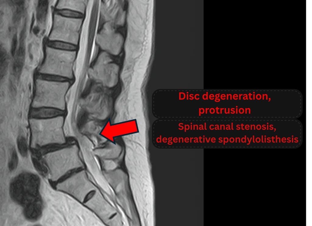 - L4/5: Disc degeneration, disc bulging, foraminal stenosis, spinal canal stenosis, and degenerative spondylolisthesis
