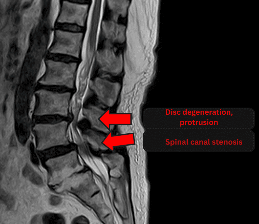 • L3/4: Disc degeneration, bulging, foraminal stenosis, spinal canal stenosis