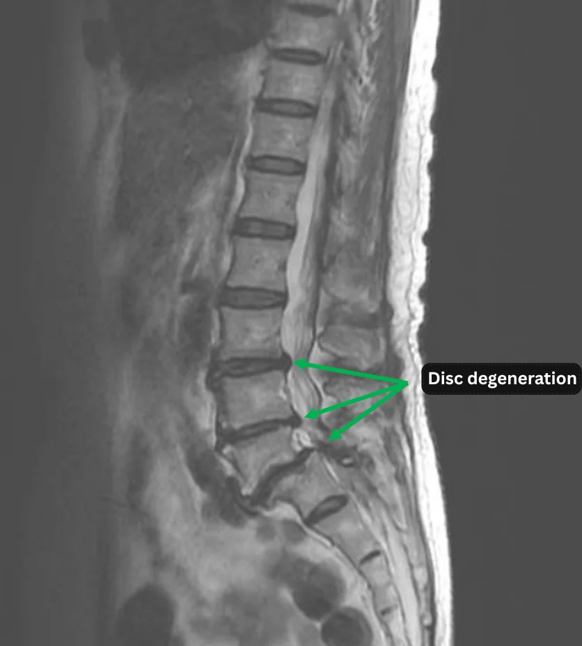 - L3/4, L4/5, L5/S: Disc degeneration