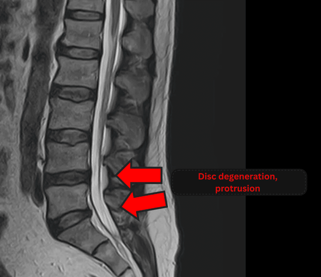 - L4/5, L5/S: Disc degeneration, bulging, and foraminal stenosis
