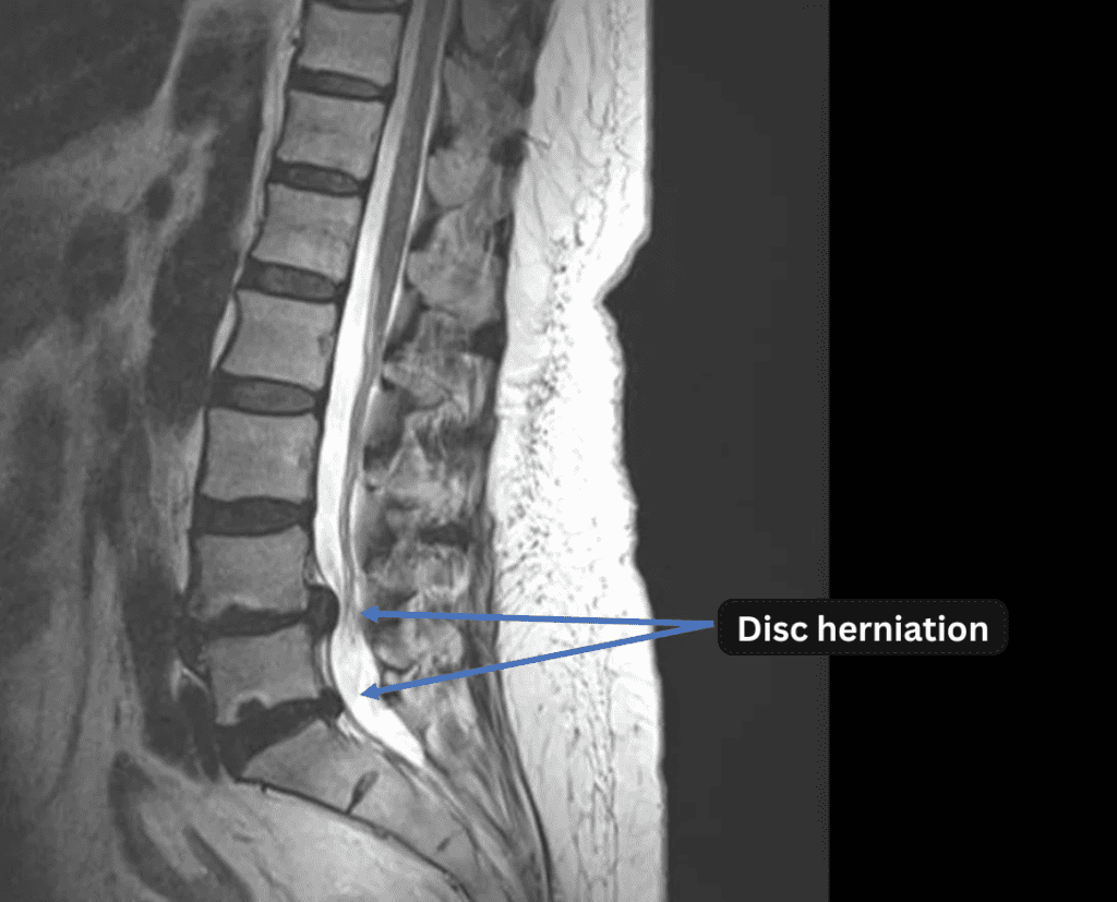 ・These findings suggest that the herniation at L4/5 and L5/S is the most likely cause of the patient’s symptoms.