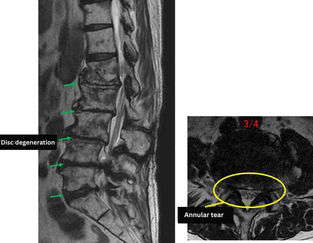 Based on these findings, disc degeneration, loss of disc height, bulging, annular tear, and foraminal stenosis at L3/4, L4/5, and L5/S were considered the most likely causes of the patient’s primary symptoms.