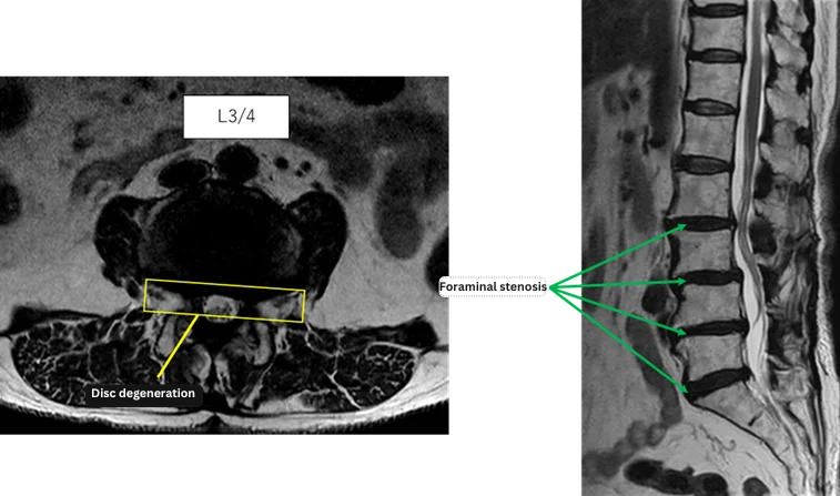 Disc degeneration and foraminal stenosis at L2/3, L3/4, L4/5, and L5/S were considered highly likely to be the primary causes of her symptoms.
