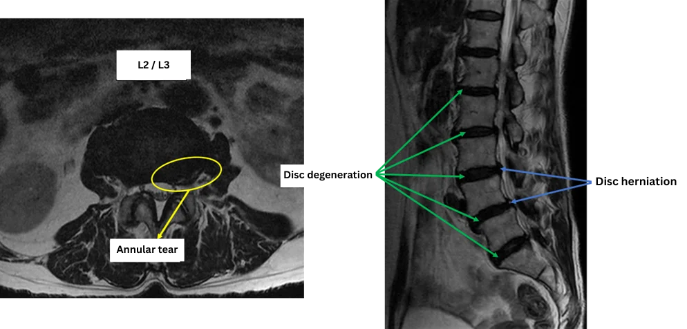 Disc degeneration, disc herniation, and annular tears were observed at L2/3, L3/4, and L4/5, which are considered the most likely causes of the primary symptoms.