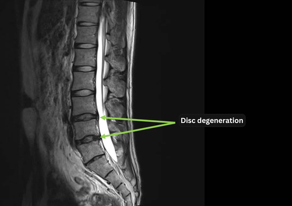 - Axial imaging at L4/5 shows annulus fibrosus tear in the intervertebral disc.