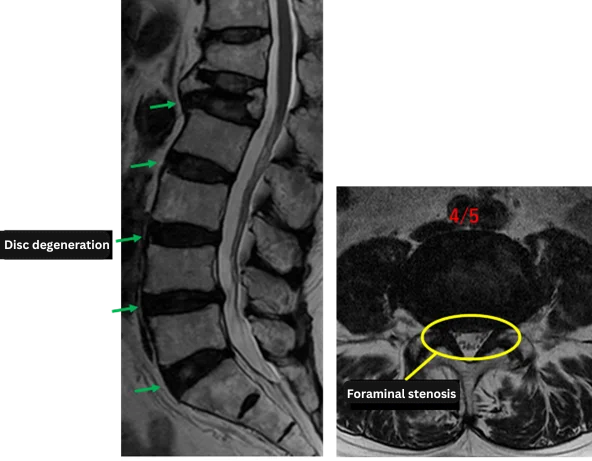 These findings indicate that degeneration, disc bulging, and bilateral foraminal stenosis at L3/4, L4/5, and L5/S are highly likely to be the primary cause of symptoms.