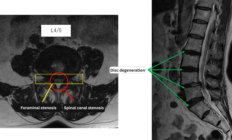 L4/5: Spinal canal stenosis, bilateral foraminal stenosis, disc degeneration