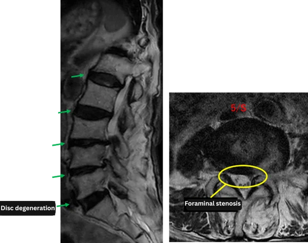 Main areas of pain and numbness: bilateral lower back pain and numbness in both legs