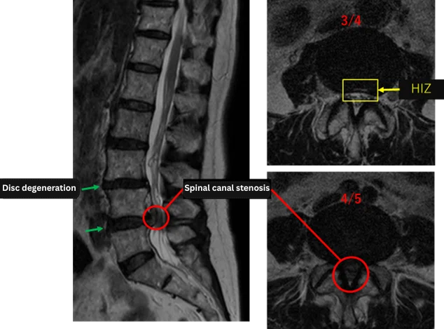 L3/4: Disc degeneration, bulging, high-intensity zone (HIZ)