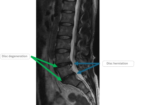 The L4/L5 and L5/S intervertebral discs showed degeneration and herniation,